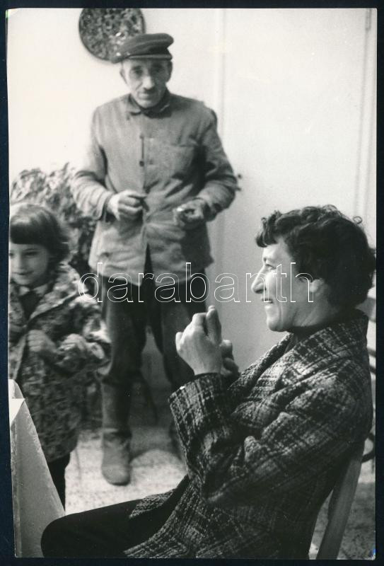 cca 1975 Galgóczi Erzsébet (1930-1989) Kossuth-díjas író, forgatókönyvíró, országgyűlési képviselő portréja társaságban, Molnár Edit (1933-) Balázs Béla-díjas fotóművész hátoldalán jelzett fotója, 17,5x12 cm