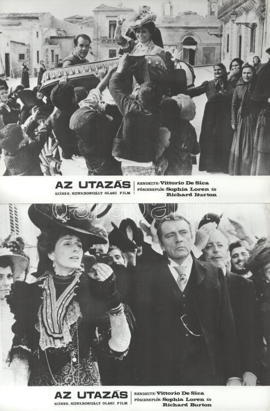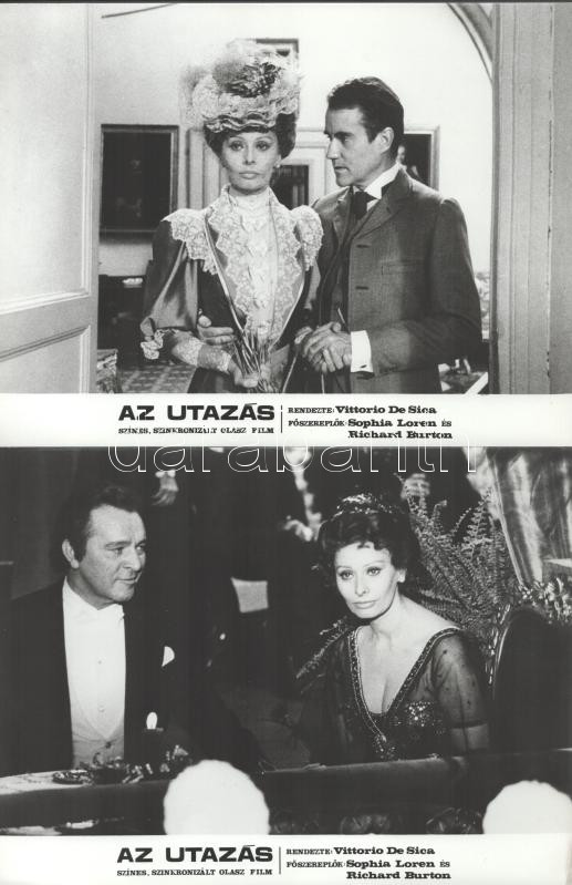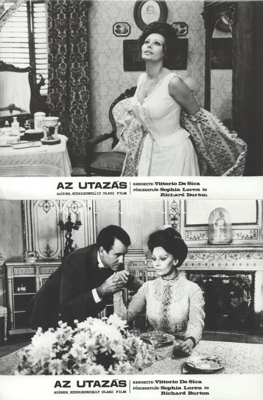 cca 1989 előtt készült, "Az utazás" című olasz film jelenetei és szereplői (főszereplők Sophia Loren és Richard Burton), 13 db vintage produkciós filmfotó (vitrinfotó, lobbyfotó) ezüst zselatinos fotópapíron, a használatból eredő (esetleges) kisebb hibákkal, 18x24 cm