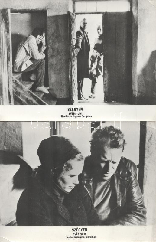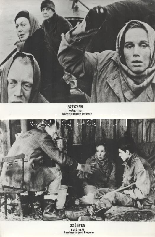 cca 1989 előtt készült, "Szégyen" című svéd film jelenetei és szereplői (rendezte Ingmar Bergman), 12 db vintage produkciós filmfotó (vitrinfotó, lobbyfotó) ezüst zselatinos fotópapíron, a használatból eredő (esetleges) kisebb hibákkal, 18x24 cm