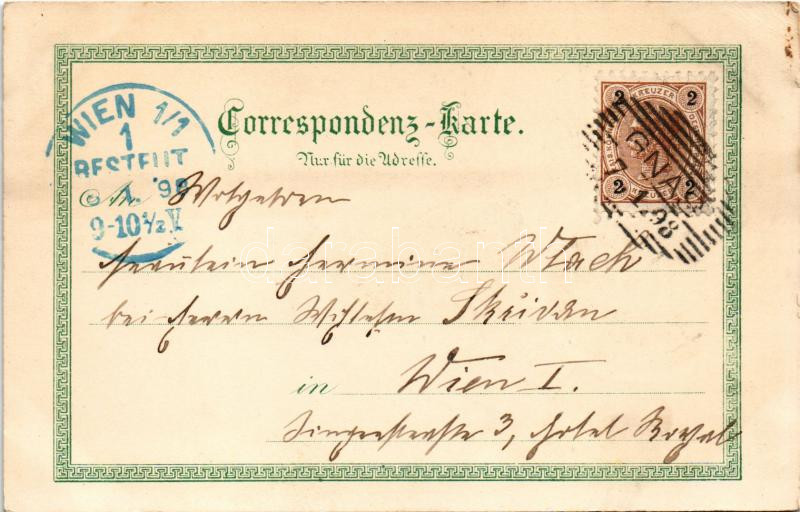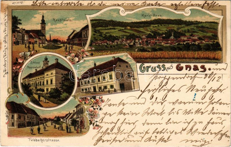1898 (Vorläufer) Gnas (Steiermark), Hauptplatz, Schloss Pappendorf, Feldbacherstrasse / main square, castle, street view. Druck u. Verlag v. Regel & Krug Art Nouveau, floral, litho (EK)