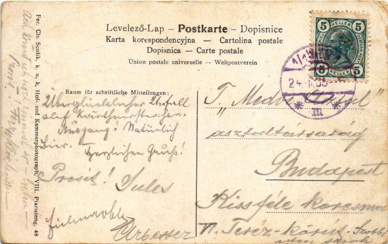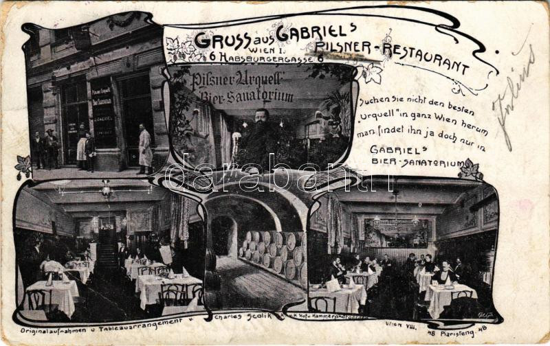 1905 Wien, Vienna, Bécs; Gruss aus Gabriels Pilsner-Restaurant. Habsburgergasse 6. Gabriel's Bier-Sanatorium. Originalaufnahmen u. Tableauarrangement v. Charles Scolik k.u.k. Hof. u. Kammerphotograph / restaurant and beer hall, interior with guests and waiters. Art Nouveau, floral (EB)