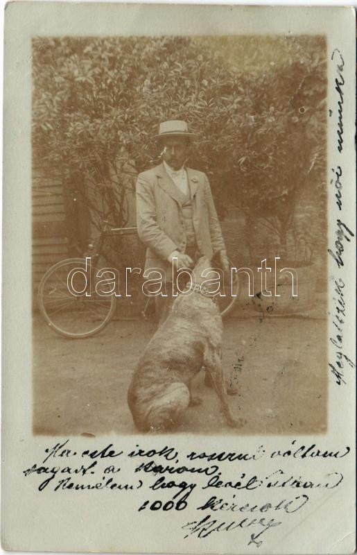 Leírás: 1900 Arad, férfi kutyával és kerékpárral / man with dog and bicycle. photo (EK)