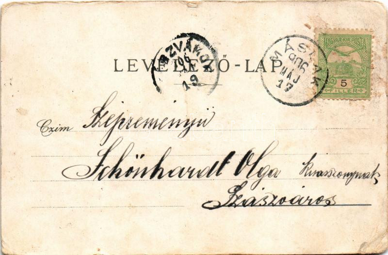 1906 Máriaradna, Radna (Lippa, Lipova); Gnadenbild zu Maria-Radna, Kirche, Inneres der Kirche, Maria Lourdes-Statue, Heil. Dreifaltigkeitsgruppe / Kegytemplom, Kegyelemkép, Szentháromság szobor, templom belseje, Lourdes-i Mária szobor / pilgrimage church, interior. Fischer G. Art Nouveau, floral, litho (szakadás / tear)
