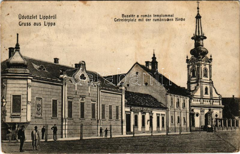 1912 Lippa, Lipova; Búza tér a román (ortodox) templommal, Takarékpénztár. W.L. Bp. / Getreideplatz mit der rumänischen Kirche / square, Romanian Orthodox church, savings bank (fl)