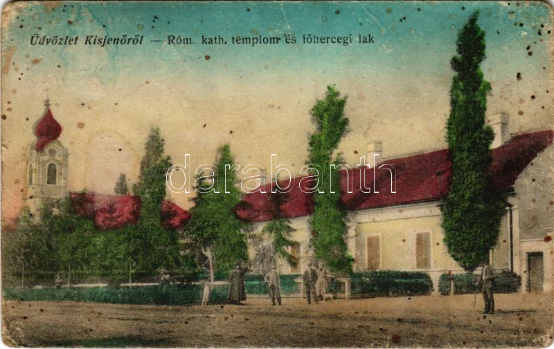1917 Kisjenő, Kis-Jenő, Chisineu-Cris; Római katolikus templom és főhercegi lak. Kaufmann Manó és Társa kiadása / Catholic church, royal castle, villa (fl)