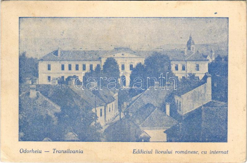 1940 Székelyudvarhely, Odorheiu Secuiesc; Edificiul liceului romanesc, cu internat / Román gimnázium és internátus / Romanian high school and boarding school + "1940 Székelyudvarhely visszatért" So. Stpl (EK)