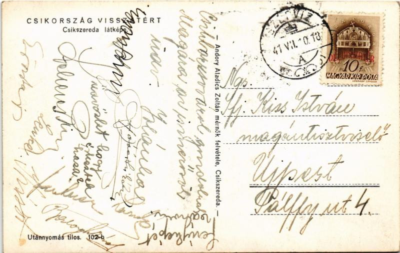 1941 Csíkszereda, Miercurea Ciuc; látkép. Csíkország visszatért. Andor... https://www.darabanth.com/hu/504-Gyorsarveres/504.0/Kepeslapok/Erdely~2000002/1941-Csikszereda-Miercurea-Ciuc-latkep-Csikorszag-visszatert-Andory-Aladics-Zoltan-felve~II3409162