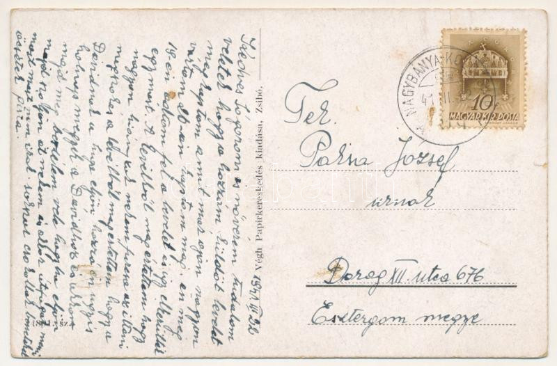 1941 Zsibó, Jibou; Rákóczi út, Kossuth utca, Járásbíróság, Református templom, Mezőgazdasági bank, üzletek. Végh kiadása / street view, district court, Calvinist church, bank, shops + "NAGYBÁNYA - KOLOZSVÁR 319. sz" vasúti mozgóposta bélyegző (fl)