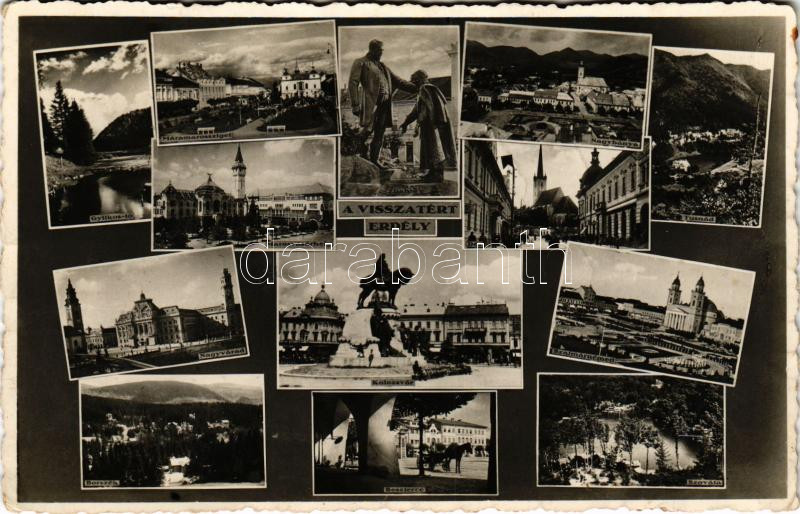 1943 A visszatért Erdély: mozaiklap 13 visszatért erdélyi város látképével / entry of the Hungarian troops, multi-view postcard with 13 images of Transylvanian town views (gyűrődések / creases)