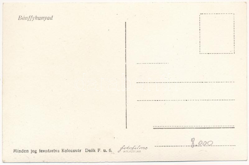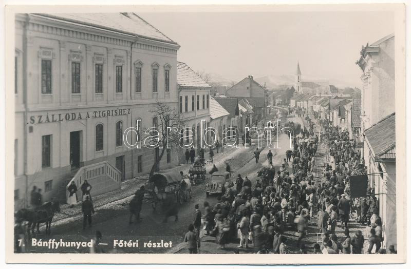 Leírás: Bánffyhunyad, Huedin; Fő tér, Szálloda a Tigrishez, piac / main square, hotel, market