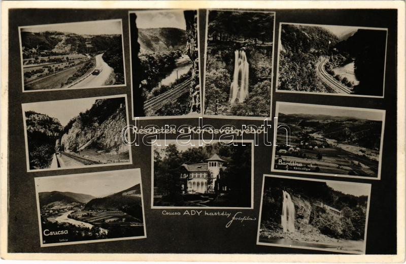 Csucsa, Ciucea; részletek a Körös völgyéből. Ady kastély (Csucsa), Barátka látképe, Zichy-barlang és vasútvonal (Rév), Királyhágó / multi-view postcard, Cris valley with castle, general view of Bratca, cave and railway line in Vadu Crisului, Bucea railway line (ragasztónyom / glue marks)