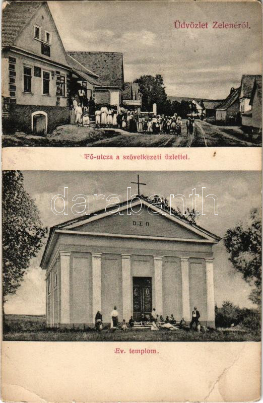 1908 Ipolyszele, Zelene (Poltár); Fő utca, evangélikus templom, Hangya szövetkezet üzlete és saját kiadása / main street, Lutheran church, cooperative shop (EB)