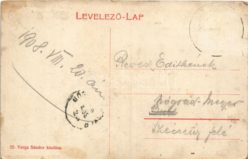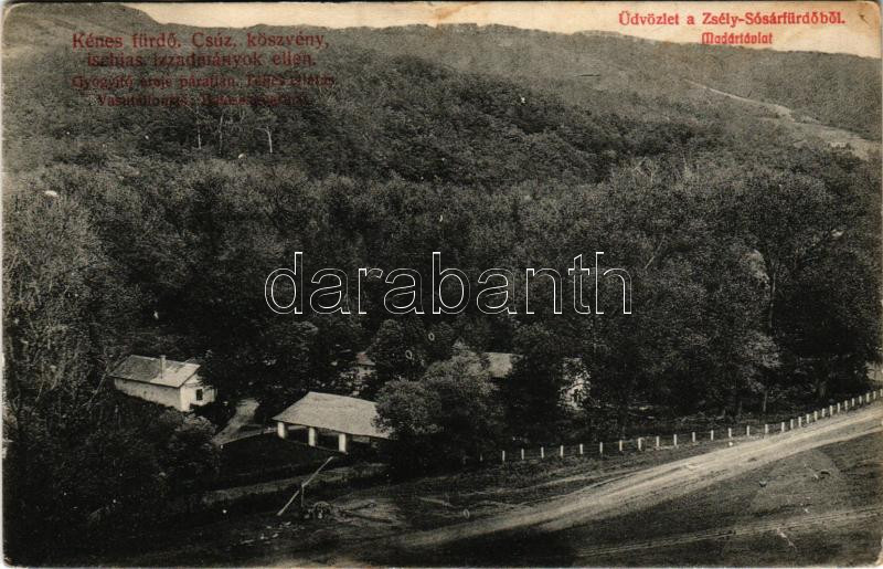 Leírás: 1908 Zsély, Zelovce; Sósár gyógyfürdő, madártávlat, kénes fürdő, csúz, köszvény ellen. Varga Sándor kiadása / Sosárske Lázne / spa (Rb)