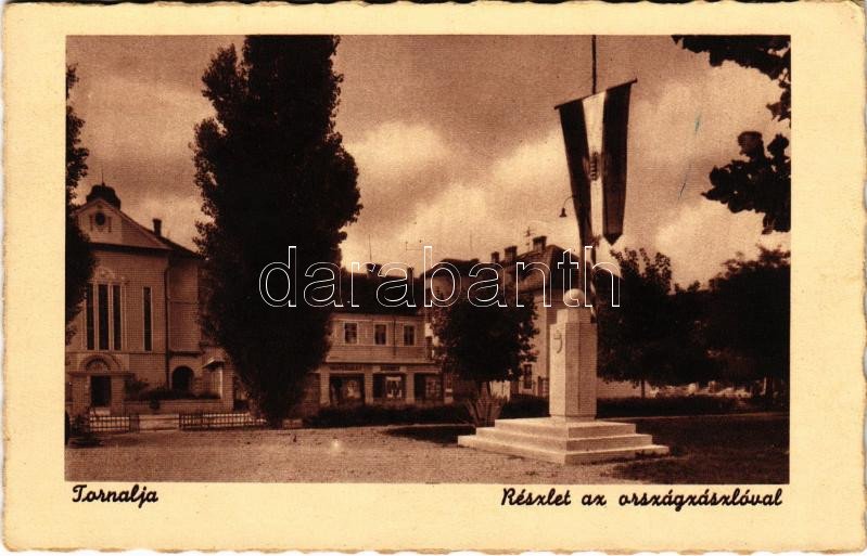 Leírás: 1943 Tornalja, Tornallya, Safárikovo, Tornala; Országzászló, üzletek. Poraczky László kiadása / Hungarian flag, shops