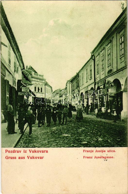1906 Vukovár, Vukovar; Franje Josipa ulica / Franz Josefsgasse. Verlag L. H. Freund / utca, J. Psenica, Herman Lyon, Velkovic üzlete / street, shops (EK)