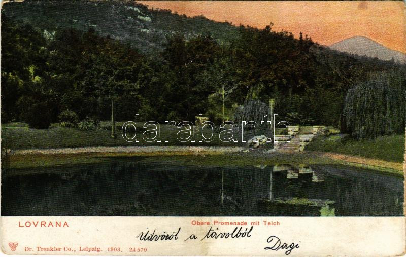 Leírás: 1908 Lovran, Lovrana, Laurana; Obere Promenade mit Teich / promenade, lake (kis szakadás / small tear)