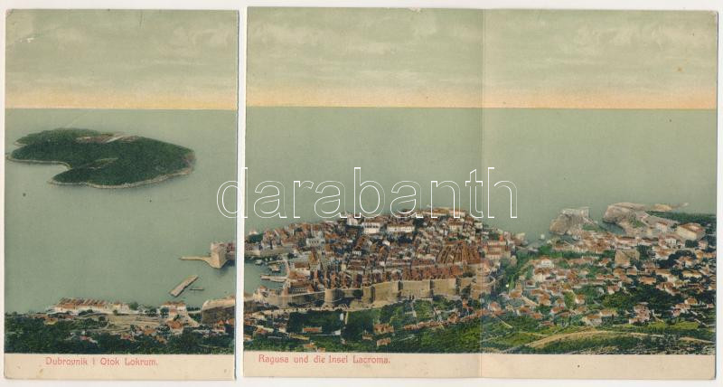 Dubrovnik, Ragusa; Otok Lokrum / Insel Lacroma. Verlag I. Kulisic / látkép, sziget. 3-részes kihajtható panorámalap, az egyik levált / general view, island. 3-tiled folding panoramacard, with 1 separated part (b)