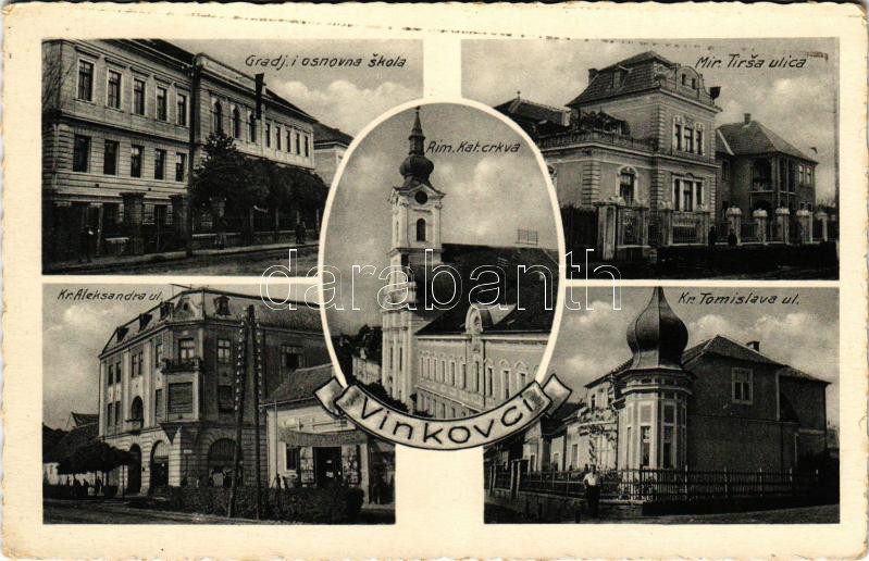 Leírás: Vinkovce, Vinkovci; Gradj. i osovna skola, Mir. Tirsa ulica, Rim. Kat. crkva, Kr. Aleksandra ul., Kr. Tomislava ul. Naklada Ivan Matievac / mozaiklap 5 képpel: iskola, templom, utcaképek / multi-view postcard with 5 images: school, church, street views (ázott sarok / wet corner)