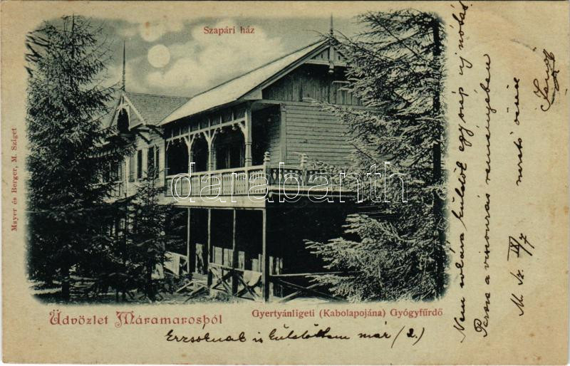 1899 Gyertyánliget, Polyana-Gyertyánliget, Kabola Polyána, Kobyletska Poliana (Máramaros, Maramures); Szapári ház este holdfényben, gyógyfürdő. Mayer és Berger kiadása / spa, villa at night in moonlight (vágott / cut)