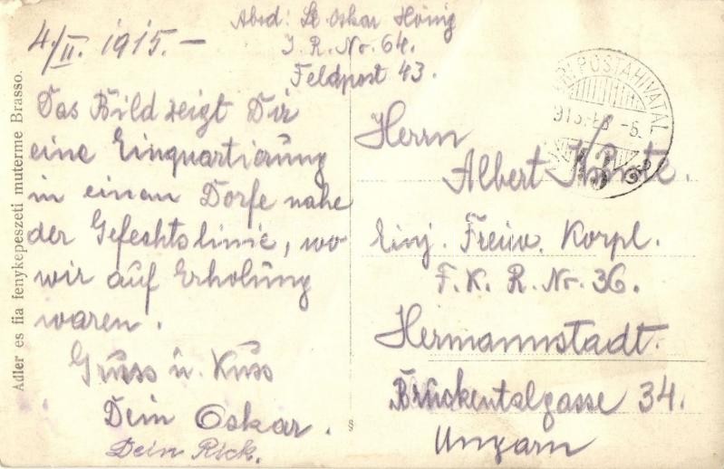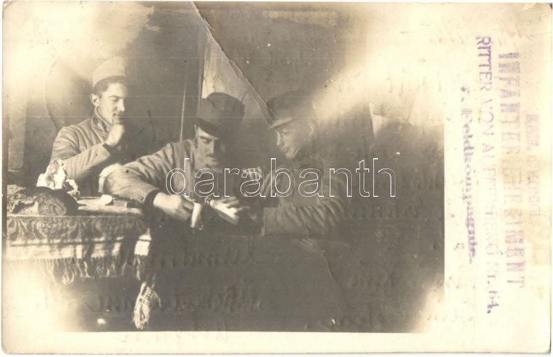 1915 Brassó, Kronstadt, Brasov; Első világháborús katonai lap, Cs. és kir. Ritter von Auffenberg 64. sz. gyalogezred katonái borozás közben / WWI K.u.K. military, soldiers of the K.u.k. Infanterieregiment Ritter von Auffenberg Nr. 64 Feldkompagnie, Adler és fia photo (fa)