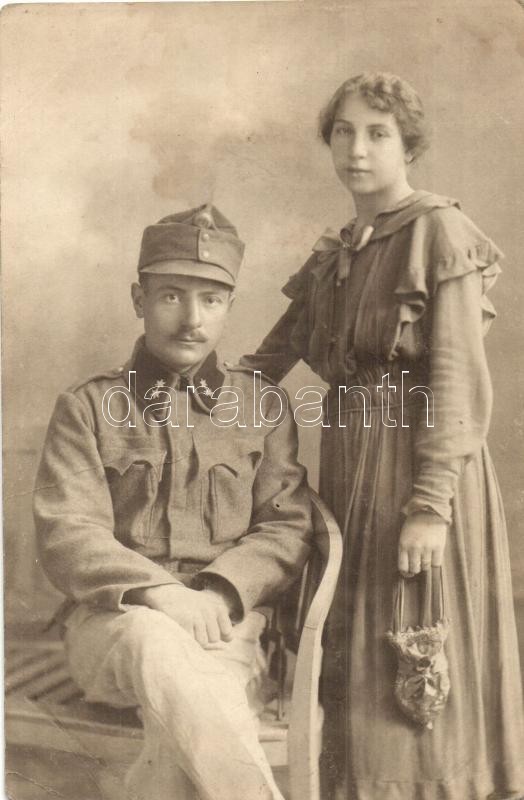 Leírás: Első világháborús magyar katona kedvesével / WWI K.u.k. Hungarian soldier with his love, Hungaria photo (ragasztónyom / gluemark)