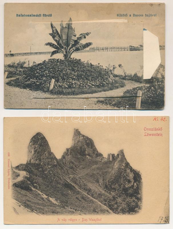2 db RÉGI város képeslap: Oroszlánkő, Balatonalmádi-fürdő (leporello) / 2 pre-1945 town postcards: Vrsatské Podhradie, Balatonalmádi-fürdő, with 1 leporello card