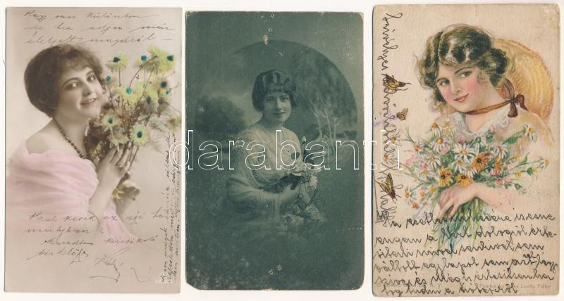 Leírás: 3 db RÉGI zsáner motívum képeslap vegyes minőségben: hölgyek / 3 pre-1945 motive postcards in mixed quality: ladies