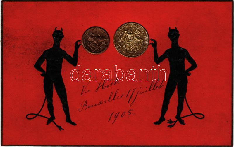 1905 Krampusz pénzérmékkel (1 cent), dombornyomott művészlap. H. M. Do... https://www.darabanth.com/hu/504-Gyorsarveres/504.0/Kepeslapok/Krampusz~2000064/1905-Krampusz-penzermekkel-1-cent-dombornyomott-muveszlap-H-M-Dobrecourt-Krampuss-with~II3422623