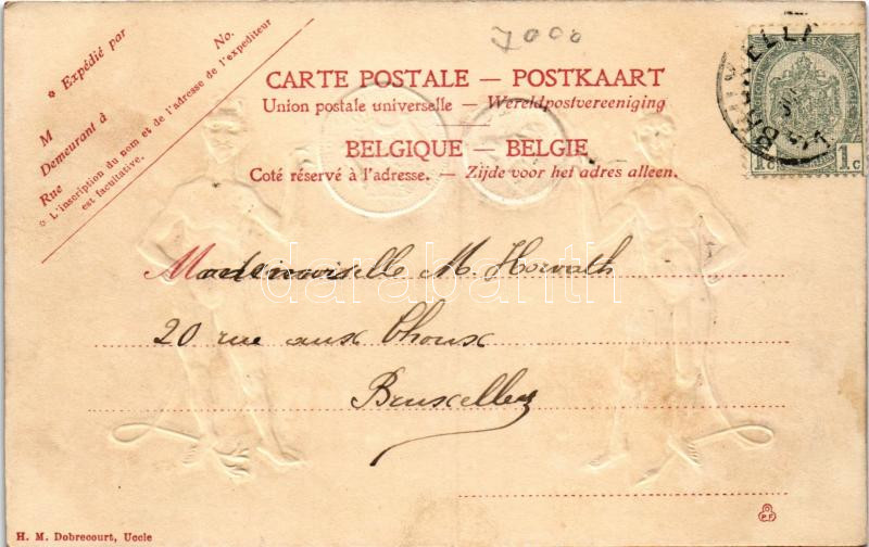 Leírás: 1905 Krampusz pénzérmékkel (1 cent), dombornyomott művészlap. H. M. Dobrecourt / Krampuss with coins (1 cent). Emb.