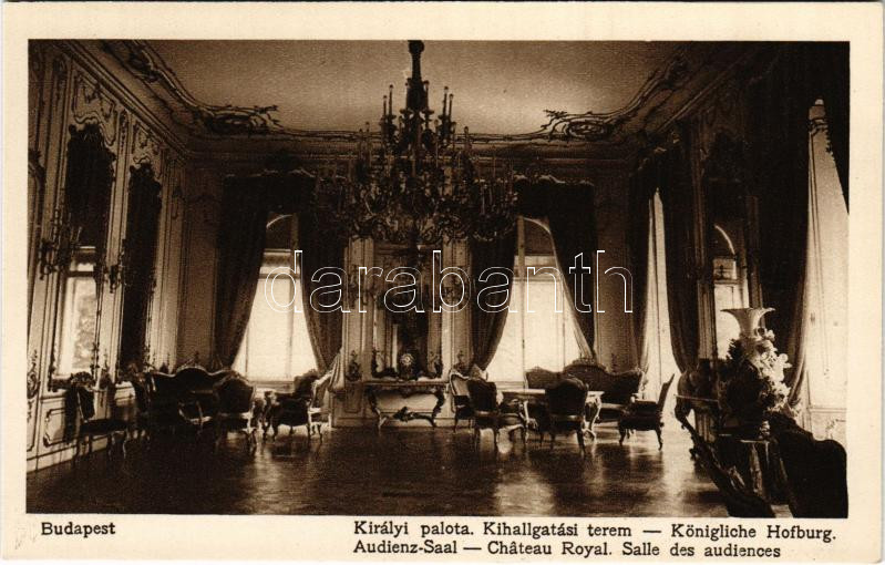 Budapest I. Királyi palota belső, kihallgatási terem. Rigler rt. https://www.darabanth.com/hu/504-Gyorsarveres/504.0/Kepeslapok/Magyarorszag~2000001/Budapest-I-Kiralyi-palota-belso-kihallgatasi-terem-Rigler-rt~II3293041
