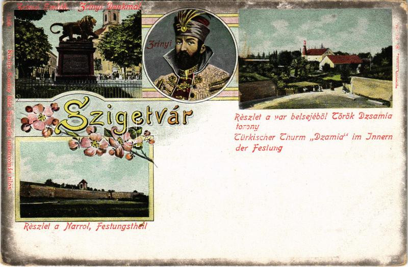 Leírás: Szigetvár, Zrínyi emlékmű, részlet a vár belsejéből, Török Dzsamia torony, Részlet a várról. Kozáry Ede kiadása Art Nouveau, floral (EK)