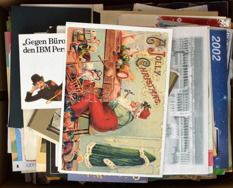 Leírás: Kb. 1000 db MODERN üdvözlőlap dobozban, ünnepek, művészet, reklám stb. / Cca. 1000 modern greeting postcards in a box: feasts, art, advertisement etc.