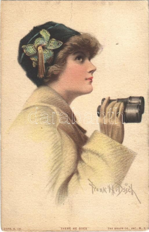 Leírás: 1914 "There he goes" Lady art postcard, lady with binoculars, The Knapp Co. Paul Heckscher Imp. No. 1025-1. s: Frank H. Desch (fa)