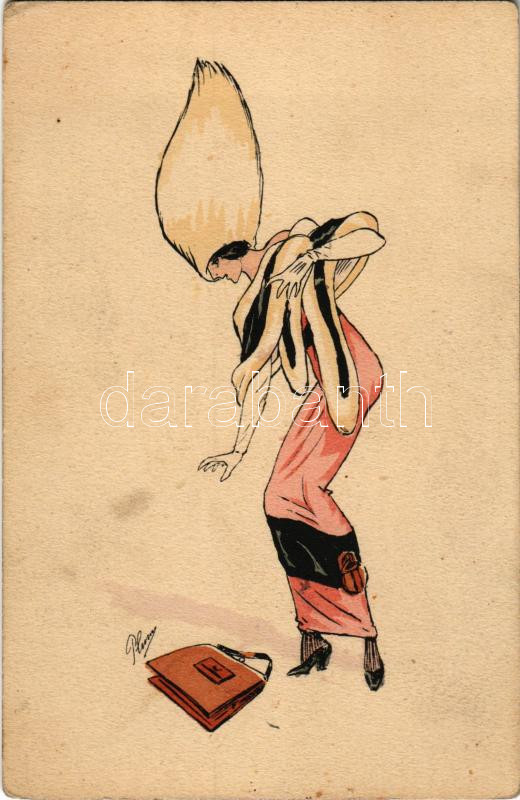 French elegant lady with bag art postcard. G. H. (Paris) s: Plum (EK) https://www.darabanth.com/hu/504-Gyorsarveres/504.0/Kepeslapok/Muveszlapok~2000069/French-elegant-lady-with-bag-art-postcard-G-H-Paris-s-Plum-EK~II3422909