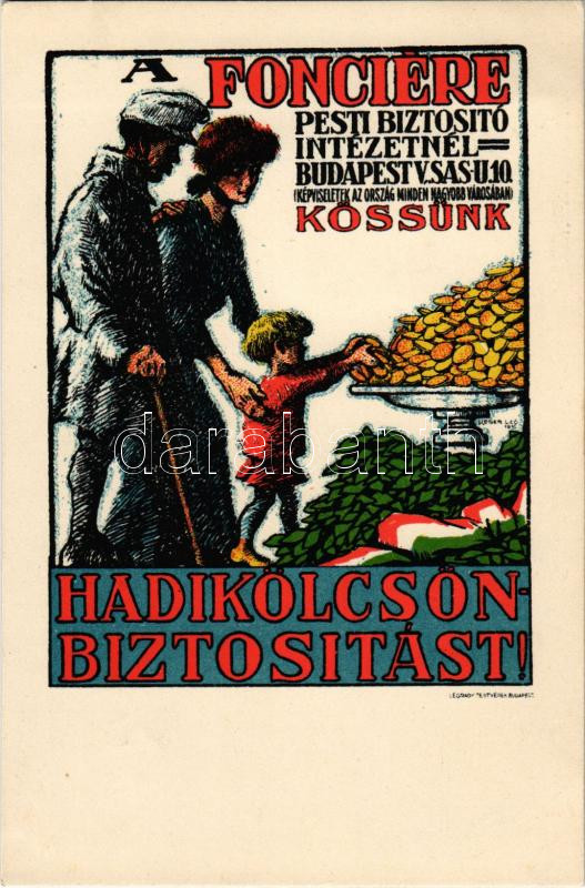 1918 Kössünk Hadikölcsön-Biztosítást! A Fonciere Pesti Biztosító Intézetnél. Budapest V. Vas utca 10. Légrády Testvérek kiadása / WWI Hungarian war loan propaganda by the Fonciere Insurance Company s: Kober Leó