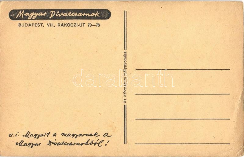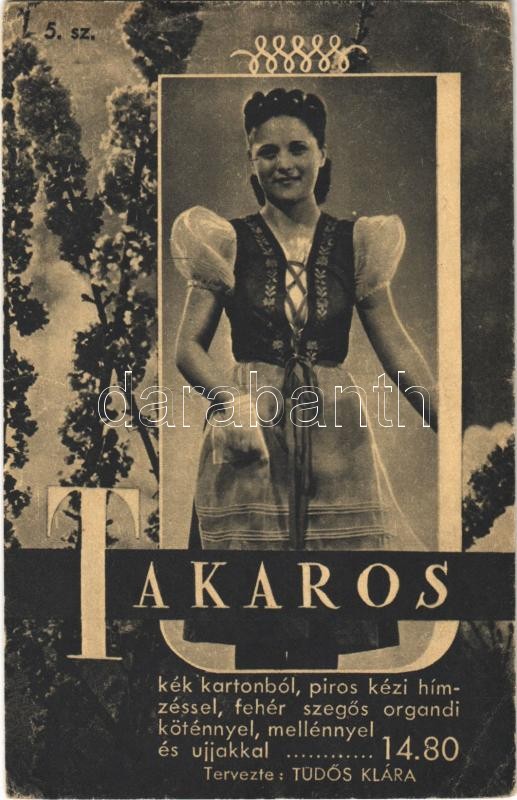 "Takaros" Tervezte: Tüdős Klára. Magyar Divatcsarnok reklámlapja. "Magyart a magyarnak a Magyar Divatcsarnokból!" / Hungarian fashion store advertisement (EB)