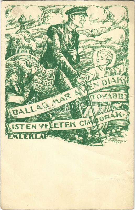 Leírás: Ballag már a vén diák tovább, Isten veletek cimborák. Emléklap. Studentika / Hungarian studentica art postcard s: Márton L. (EB)