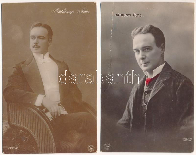 Leírás: Ráthonyi Ákos - 2 db RÉGI fotós képeslap vegyes minőségben. Strelisky, Kossak Foto / 2 pre-1945 Hungarian actor photo postcards in mixed quality