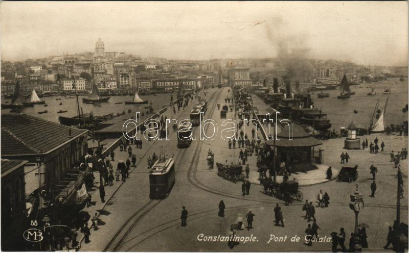 Constantinople, Istanbul; Pont de Galata / bridge, trams https://www.darabanth.com/hu/504-Gyorsarveres/504.0/Kepeslapok/Torokorszag~2000039/Constantinople-Istanbul-Pont-de-Galata-bridge-trams~II3247161