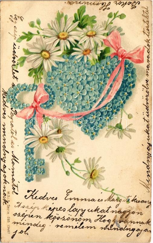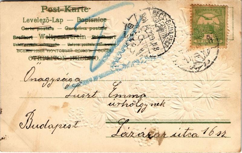 Leírás: 1904 Art Nouveau, floral, Emb. litho greeting card (lyuk / pinhole)