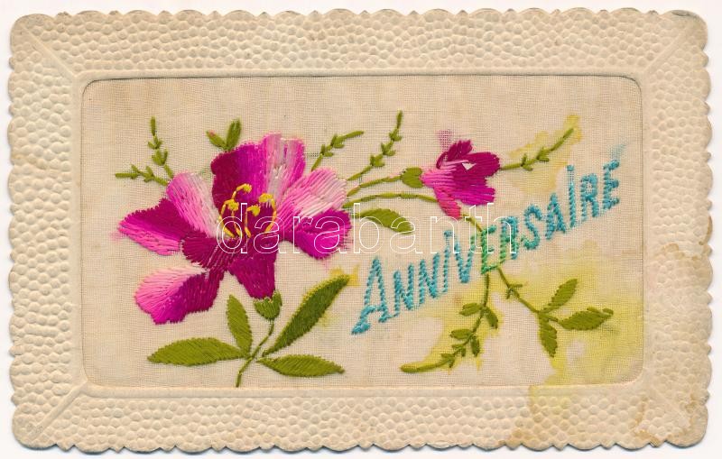 Anniversaire / Romantic greeting art postcard with silk embroidery (áz... https://www.darabanth.com/hu/504-Gyorsarveres/504.0/Kepeslapok/Udvozlolapok-Unnepek~2000082/Anniversaire-Romantic-greeting-art-postcard-with-silk-embroidery-azott-wet-damage~II2405245