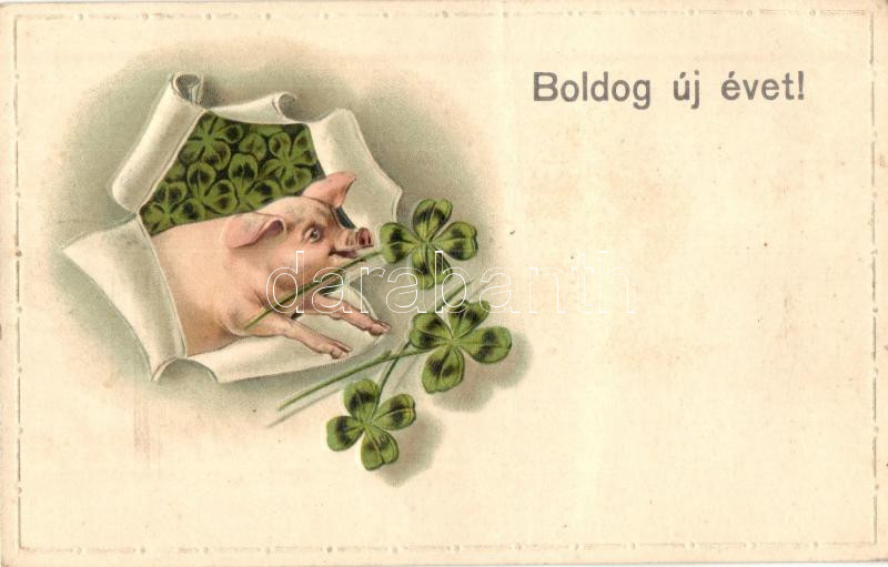 Boldog Új Évet! / New Year, pig with clovers, Emb. litho (fa) https://www.darabanth.com/hu/504-Gyorsarveres/504.0/Kepeslapok/Udvozlolapok-Unnepek~2000082/Boldog-Uj-Evet-New-Year-pig-with-clovers-Emb-litho-fa~II1460865