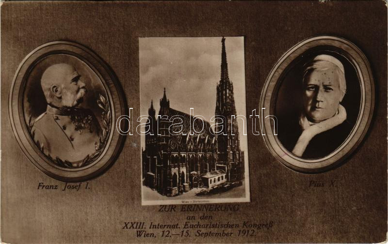 1912 Zur Erinnerung an den WWIII. Internat. Eucharistischen Kongress Wien, 12-15. September 1912, Franz Josef, Pius X. E.B.W. / XXIII. Nemzetközi Eucharisztikus Kongresszus Bécsben, Ferenc József császár, X. Pius pápa / church, Franz Joseph I of Austria, Pope Pius X (EK)