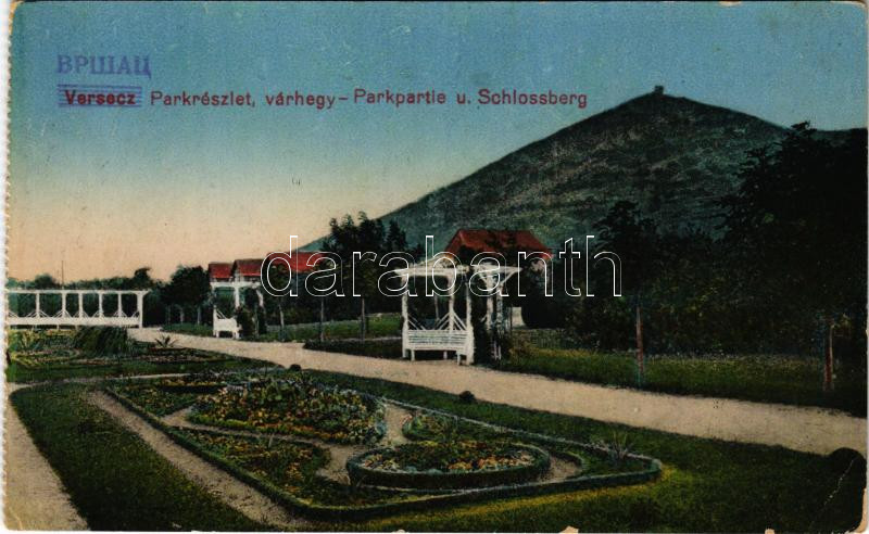 Leírás: Versec, Werschetz, Vrsac; Várhegy és parkrészlet, képeslapfüzetből / Schlossberg / castle hill, from a postcard booklet (EB)