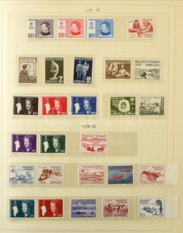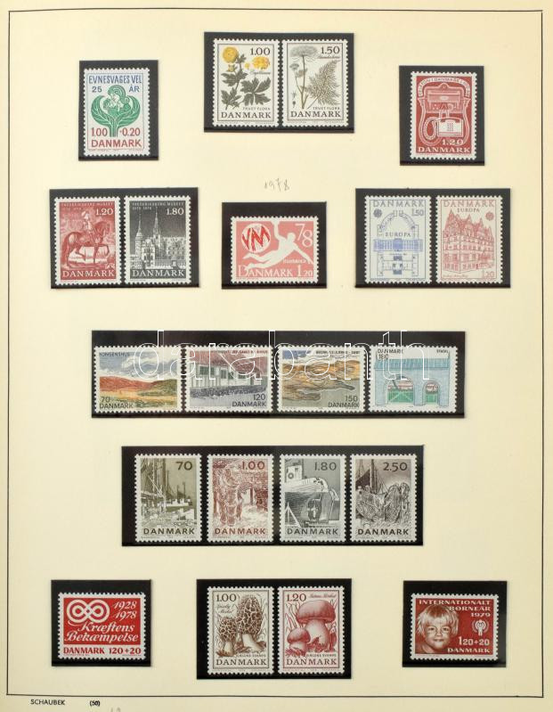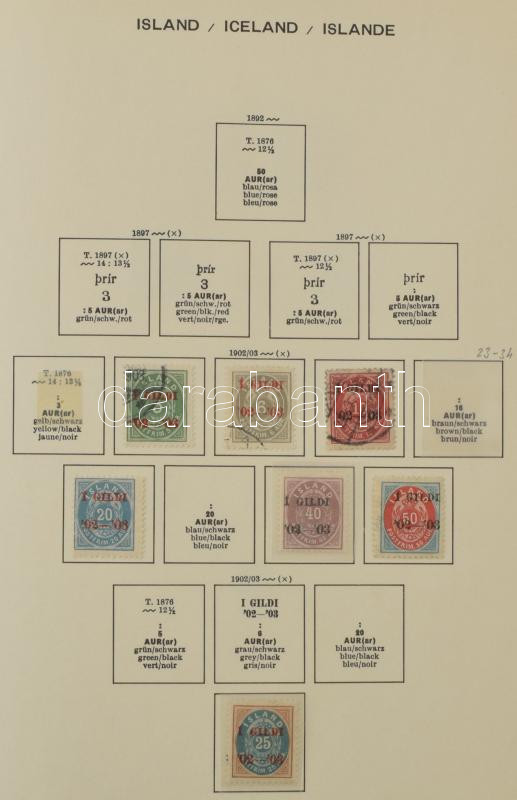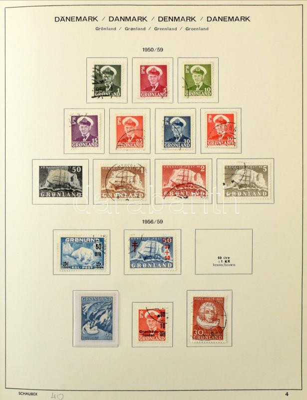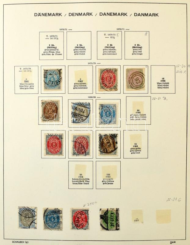 Leírás: Gyűjtemény maradvány Schaubek albumban: Dánia 585 db bélyeg, Grönland, Feröer 200 db bélyeg, Izland 420 db bélyeg