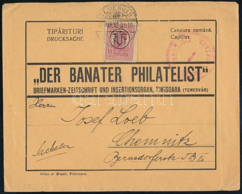 Leírás: 1920 Temesvári román megszállás cenzúrázott nyomtatvány román bélyeggel, túlélő "TEMESVÁR" bélyegzéssel Chemnitzbe (Németo.)