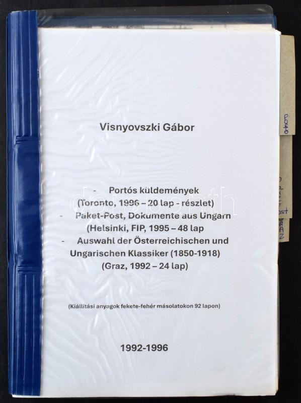 Leírás: Visnyovszki Gábor: Portós küldemények , Paket-Post + gráci kiállítás 1992-1996-os kiállítási anyagok összesen 92 fekete-fehér fénymásolt oldalon