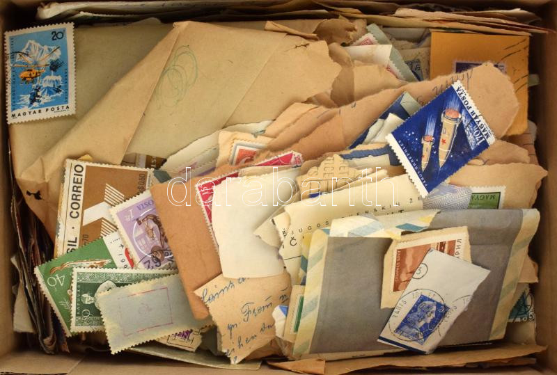 Leírás: Főleg kivágások, kevés áztatott magyar és külföldi régebbi anyag hullámkarton dobozban