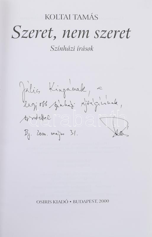 Koltai Tamás: Szeret, nem szeret. DEDIKÁLT! Bp., 2000, Osiris. Kiadói ... https://www.darabanth.com/hu/504-Gyorsarveres/504.0/Konyvek/Konyvek-Egyeb-ritkasagok~2500040/Koltai-Tamas-Szeret-nem-szeret-DEDIKALT-Bp-2000-Osiris-Kiadoi-papirkotes-dohos~II3421266