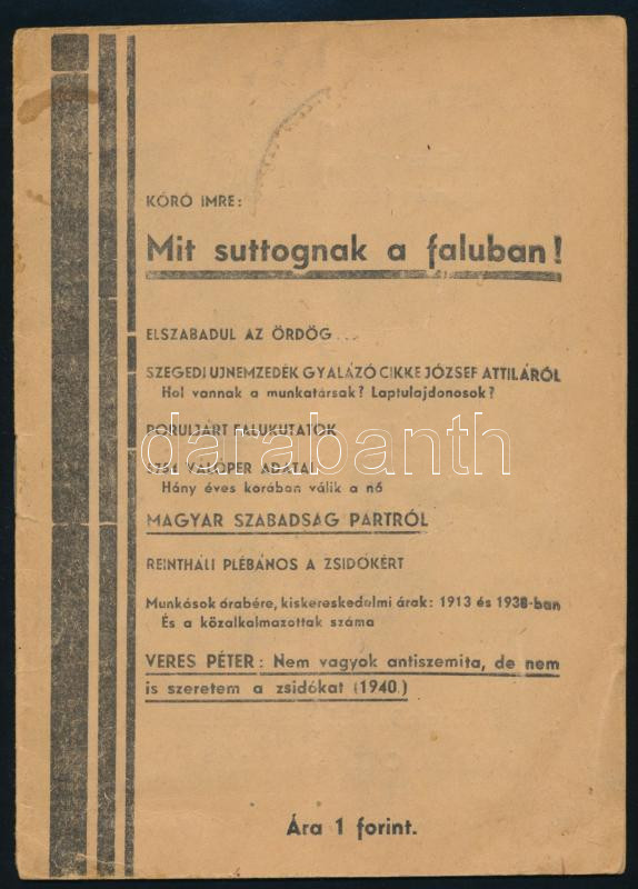 Kóró Imre: Mit suttognak a faluban... Szeged, é.n. [1947?], szerzői kiadás (Kultura-ny.), 16 p. Második kiadás. Kiadói tűzött papírkötés, a borítón és néhány lapon kisebb foltokkal.